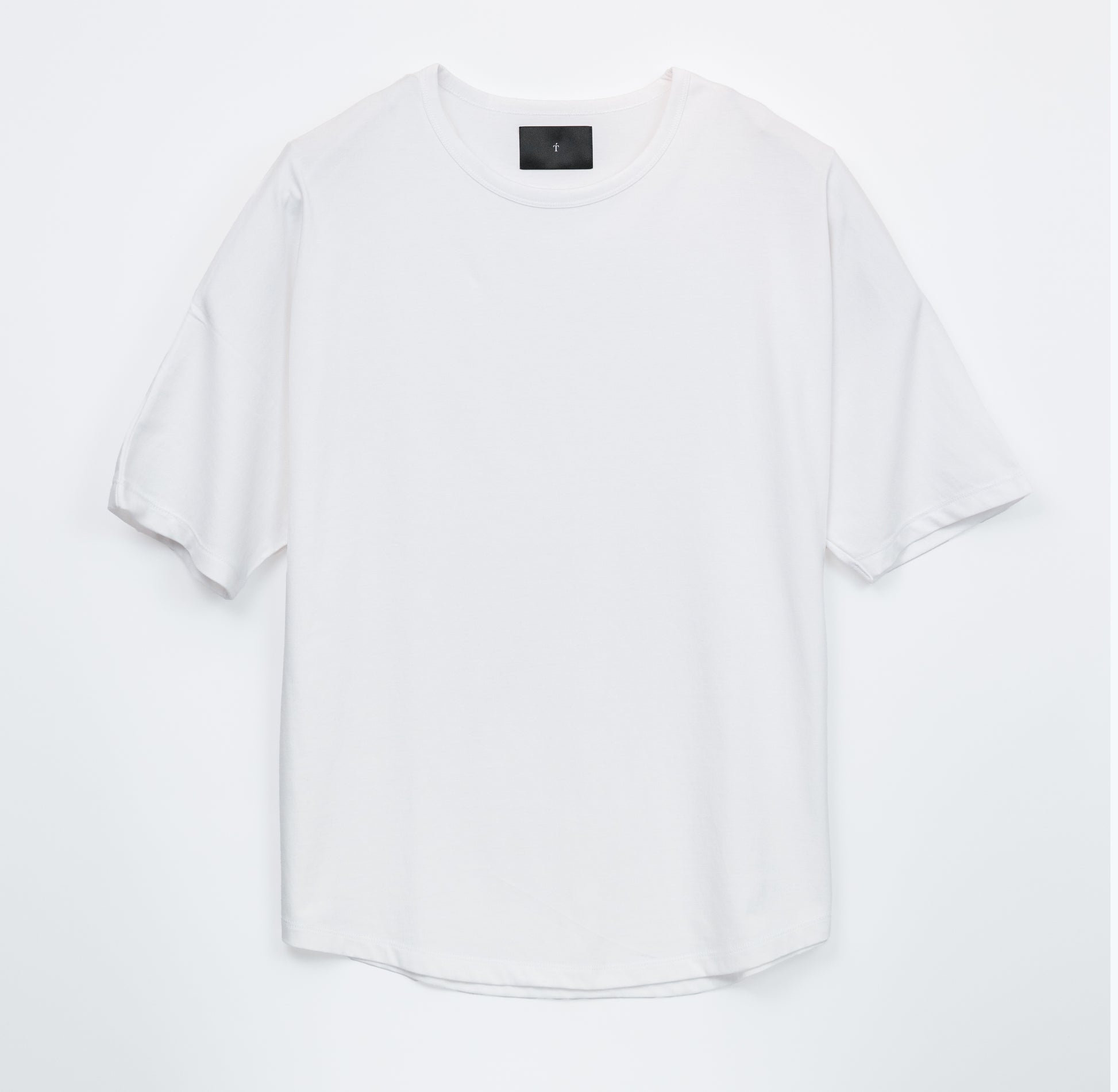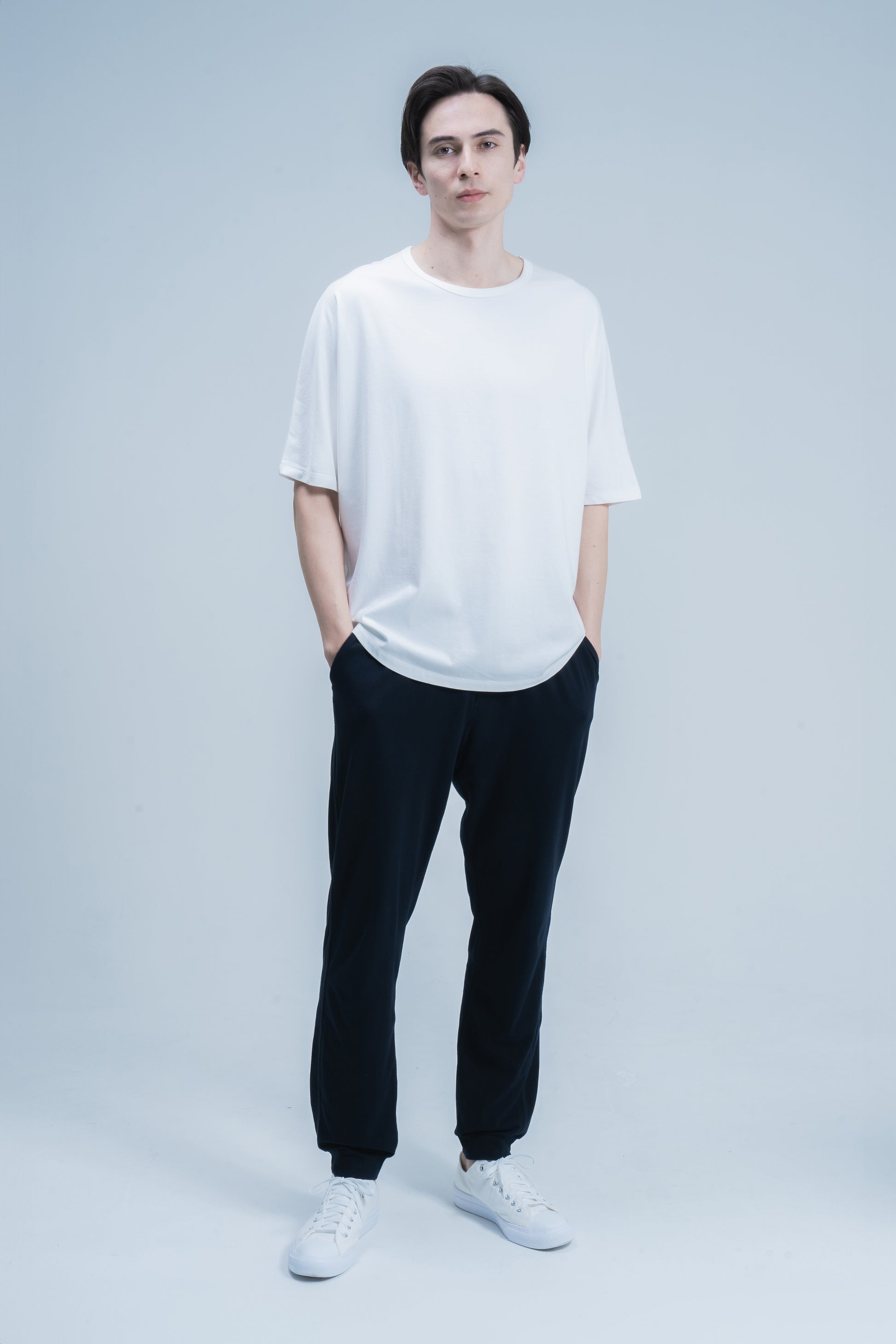 上質なロングステープルコットンの一枚の生地から生み出した、心地良さとエレガンスの際立つ、クルーネック ドルマンスリーブビッグTシャツ。 表裏一枚ずつ生地の幅一杯に大判カットし、贅沢に組み立てた袖付けラインの無いドルマンスリーブ仕立て。